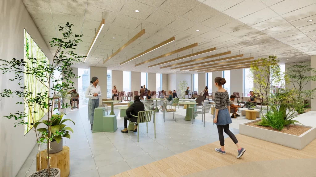 森林・公園・ウッドデッキなどをモチーフとしたエリアが点在し、集中デスク・個室・会議室・オープンイベントスペースなど、仕事のモードや目的に応じて選べる空間を提供。フィジカル・メンタル両面からパフォーマンスを支えるリフレッシュスペースや選書ライブラリーも設置。