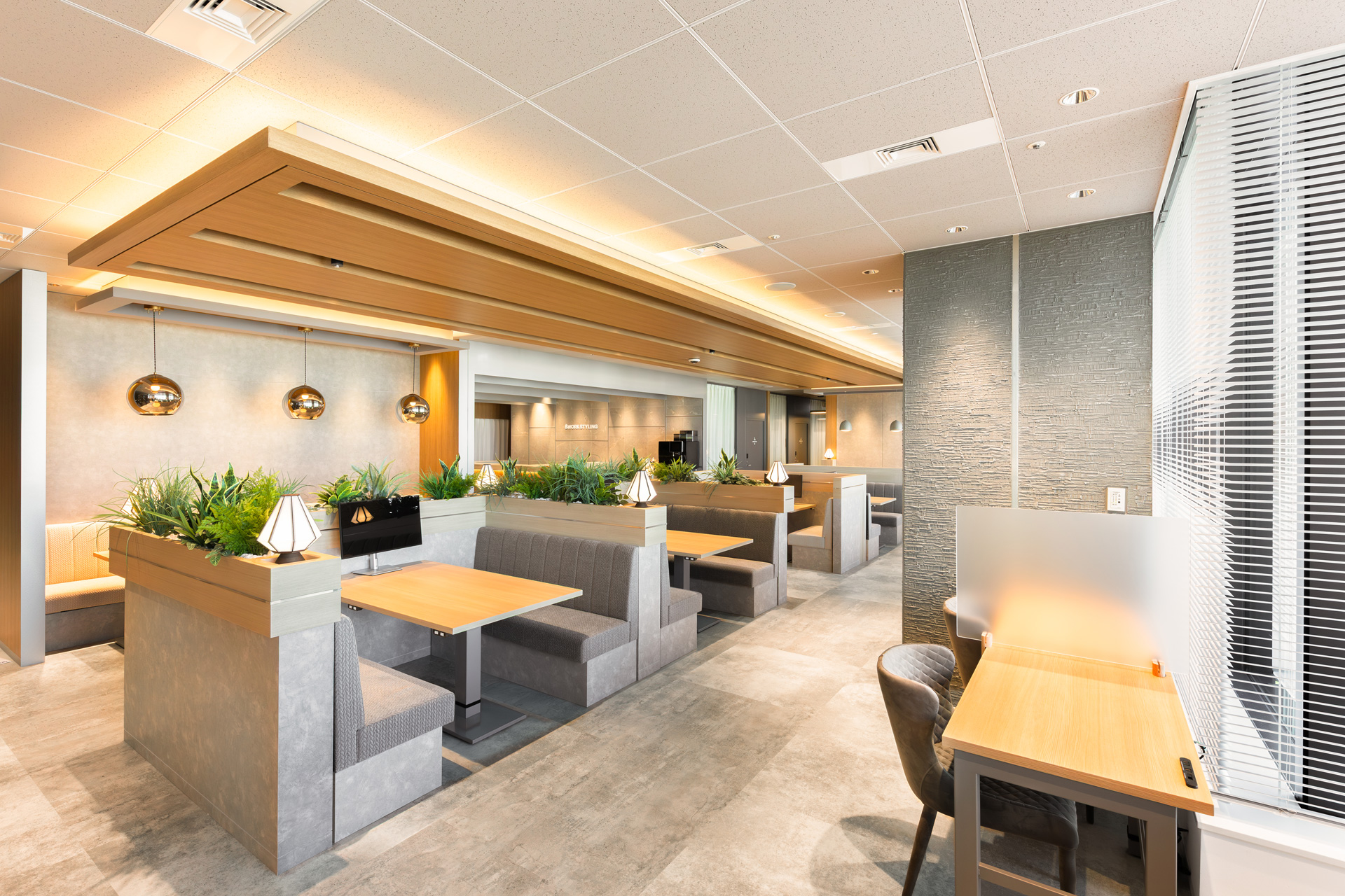 内装は、天井をあえて見せたスケルトンデザインに、木の質感を取り入れたナチュラルな設え。大きな窓からは自然光が入り、共用ラウンジはリラックスと集中のバランスが取れた空間となっています。
