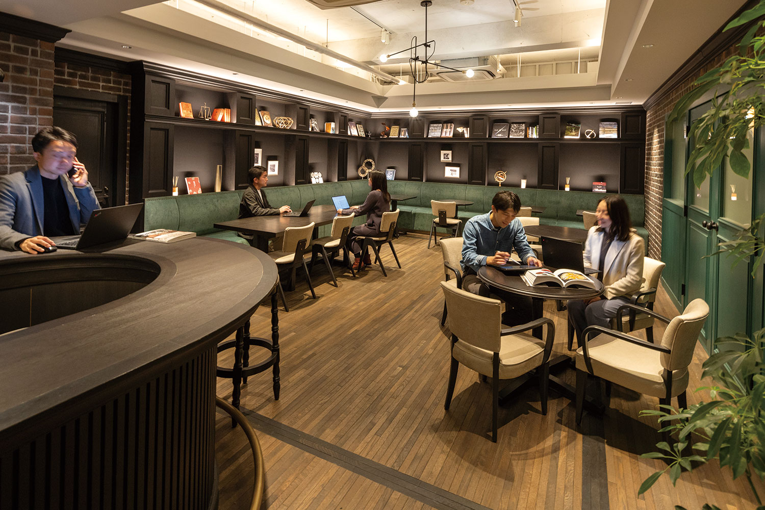 エントランスを抜けると、落ち着いた照度と上質な素材感に包まれたロビーが来訪者を迎え、ラウンジへと続く動線は、自然と気持ちを切り替えてくれます。レンガ調の壁面や重厚感のある木材、グリーンを取り入れた内装は、クラシックでありながら洗練された印象。静かに思考を深めたい個人作業から、対話を重視したミーティングまで、シーンに応じた使い分けが可能です。