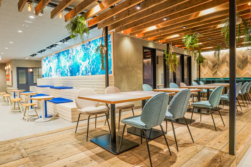 LULL TECH BEACH 渋谷は、渋谷駅C1出口から徒歩3分という好立地にあり、“渋谷にいながらビーチのような開放感を味わえる”ワークスペースとして人気です。青と白を基調とした空間は、都会の喧騒の中でも気持ちを落ち着かせつつ、クリエイティブに働ける心地よさが整えられています。