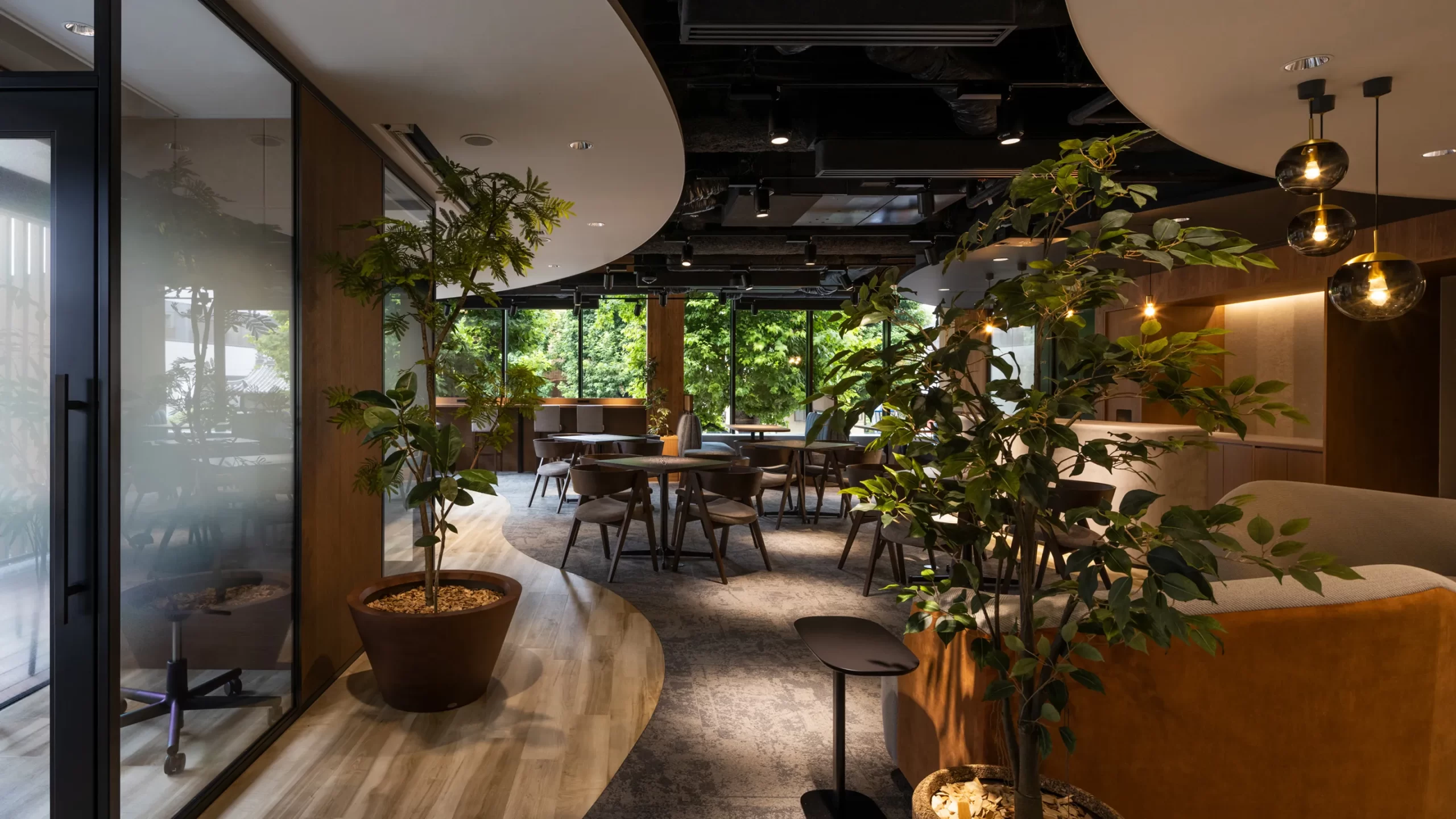 駅前の喧騒から少し距離を置いたロケーションで、都心ながら落ち着いた環境で働ける点が魅力。木目調を基調とした室内は柔らかい雰囲気があり、長時間の作業でもストレスを感じにくいデザインとなっています。